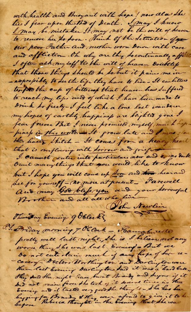 P.S. Friday Morning 7 O’clock – Hannah rested pretty well last night. She is I believe not any worse than she was last evening – But we do not entertain much if any hope of her recovery. Dr. Worthington and ? were here last evening. ? said it was a “hand base” they said she might have burnt(?) Brandy and Sugar(?) if it did not ? ? She took of it several times in the Evening and it tasted very good she thought. She has ? begging for Brandy & they were afraid to give it to her. Rebecca thought in the evening Meat(?) She was ?.
