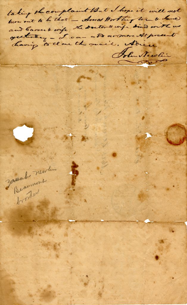 Affliction is ours, we have this day laid the Silent Tomb your poor little nephew Sister, doubt not he is now in a better world and beyond the reach of pain and affliction with others of who went before him who were near and dear to us. Our Sister Hannah continues ill, very ill and I thank God for the conviction the ? and consoling conviction that rests upon my mind that should it be His will to call her also hence she is fitted for a better and Happier State of existence. I think when our friends lie ill, perhaps upon the bed of Death we should not let our every day worldly affairs govern us too much and to keep us away from them those who do so many find their ? filled, afterward with bitter and vain regrets that they did not fly to them and if possible comfort them and help to Smooth the Bed of Death. I mean not to insinuate any thing of the kind to you Dear Sister. I think I know in some measure the difficulties that attend your leaving home to cause such a distance with your children in this warm weather and without any person perhaps to take charge of your affairs in your absence but I must urge you to if possible to come up to us as soon as you can – with any kind of convenience. I do not wish to alarm you unnecessarily but I do expect the most gloomy result – Our Dear Sister I fear cannot long continue with us, the dreadful disease prays upon her dear frame Setting the power of medicines apparently at defiance and Seemingly(?) Severing link after link of the chain of life and prostrating more and more every hour her vital powers. Oh how sadly is her appearance altered! But yesterday at it were in the Bloom of youth and Beauty flushed(?)